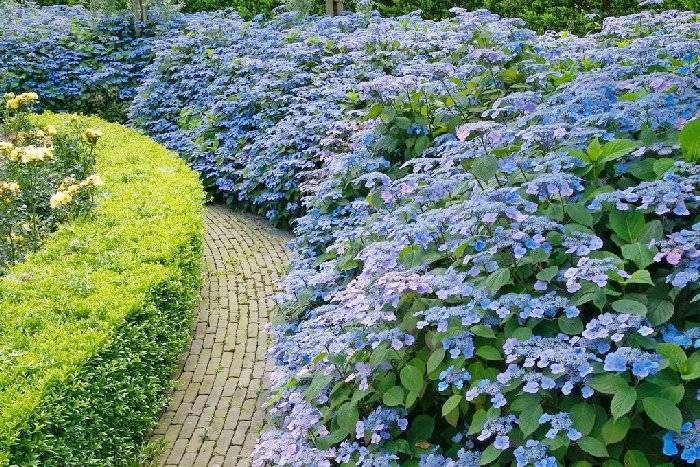 Гіллясті та розлогі кущі заввишки до 1,2 м. Чудові суцвіття у формі півсфер діаметром близько 20 см, які сформовані з дрібних центральних квіточок та великих по краю із зазубреними пелюстками. Тривале цвітіння – з липня по вересень. Типове забарвлення для цього сорту – ніжно-блакитне, але на лужних ґрунтах воно переходить у рожеве. Дуже велике темно-зелене листя, що досягає довжини 25 см. Розгалужена, але поверхнева коренева система.