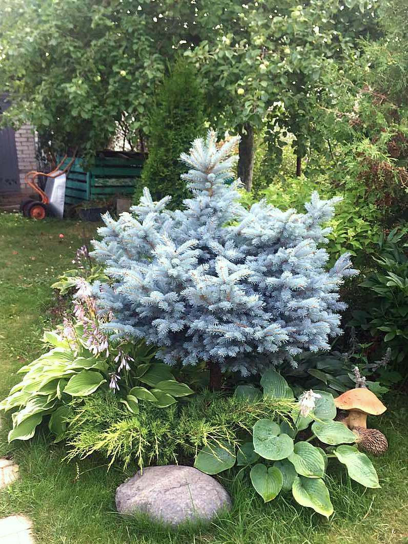 Популярна карликова форма заввишки до 1,5-2 м і діаметром крони до 2-3 м. У молодості з пухкою та неправильною, пізніше з ширококонічною або кулястою, дуже щільною, густою кроною. Шишки витягнутої форми, коричневі. Хвоя колюча, густа, яскравого сріблясто-блакитного кольору. Для підтримання правильної форми крони рекомендується формування. Росте на всіх дренованих, помірно сухих і свіжих супіщаних та суглинистих ґрунтах, від кислих до слаболужних. Погано реагує на засолення ґрунту. Застосувують в поодиноких посадках та невеликих групах, як акцент, солітер, різдвяне дерево, живопліт, кулі, піраміди, інші геометричні фігури.